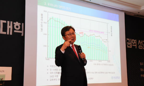 ▲ '부산대학교 전호환 총장이 '대학 혁신'의 주제로 기조강연을 진행하고 있다.